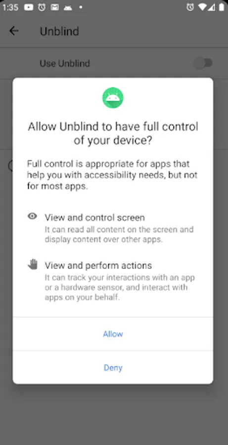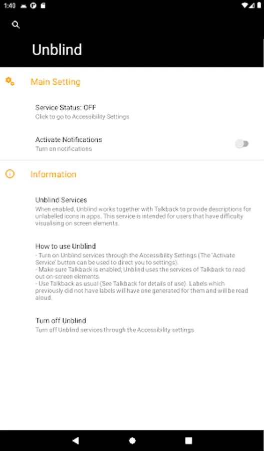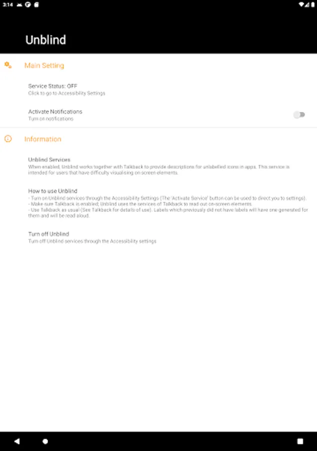 - Make sure Talkback is enabled; Unblind uses the services of Talkback to read out on-screen elements.