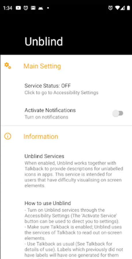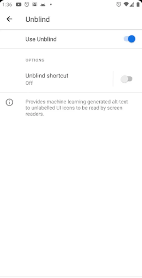 When enabled, Unblind works together with Talkback to provide descriptions for unlabelled icons in apps. This service is intended for user that have difficulty visualising on screen elements.