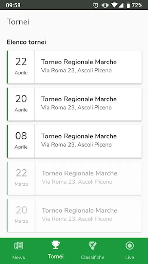 The application allows the display of news and, based on geographical location, tournaments and events in progress.