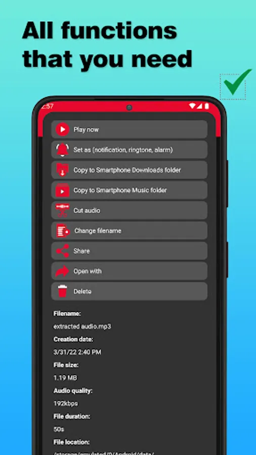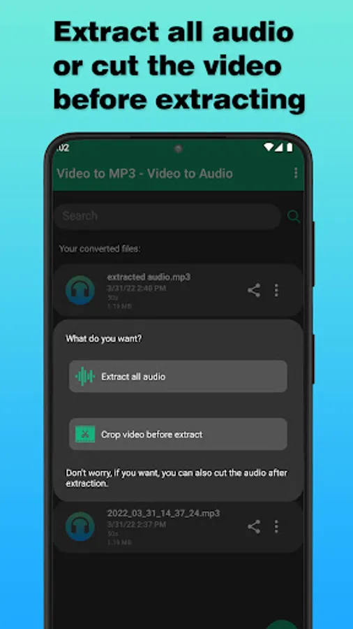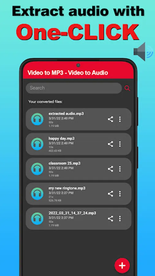 Professional result with video to audio conversion with just 1 tap and directly from your Android smartphone.