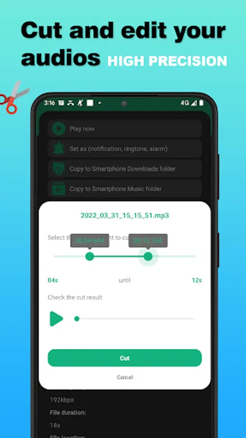 MP3 Video Converter is also an excellent audio cutter and ringtone maker. It is designed for editing video for audio, cutting, sharing with any app or person and also if you want, setting the extracted audio as ringtone, notification sound or alarm clock of your smartphone.