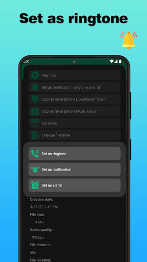 - Set as ringtone, alarm, (alarm clock) or notification.