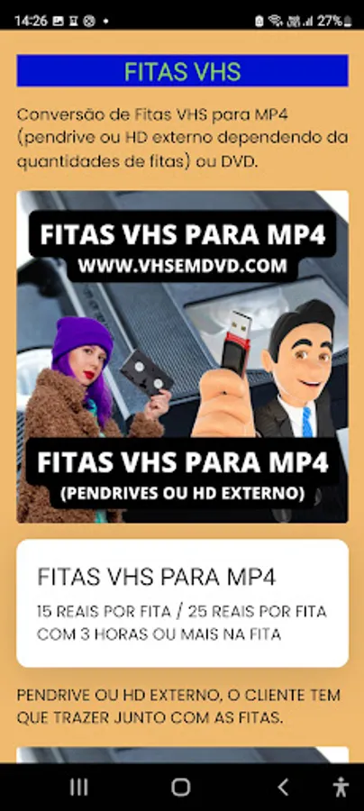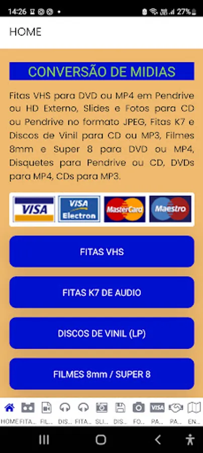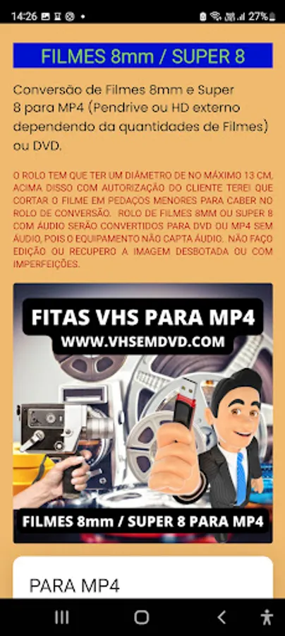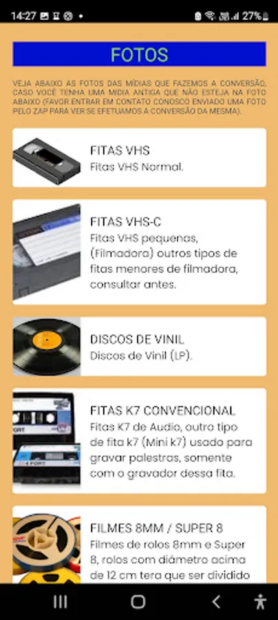 VHS Tapes for DVD or MP4 in Pendrive or External HD, Slides and Photos for CD or Pendrive in JPEG format, K7 Tapes and Vinyl Discs for CD or MP3, 8mm and Super 8 Films for DVD or MP4, Floppy Disks for Pendrive or CD, DVDs to MP4, CDs to MP3.