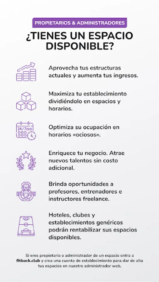 If you are a personal trainer, physical education teacher, fitness instructor or specialist in an area related to physical activity (wellness, fitness) and sport, Fitback is an ideal option to carry out your practice. You will have the option to choose the space or fit room you need to work, with the characteristics or preferences of your clients.