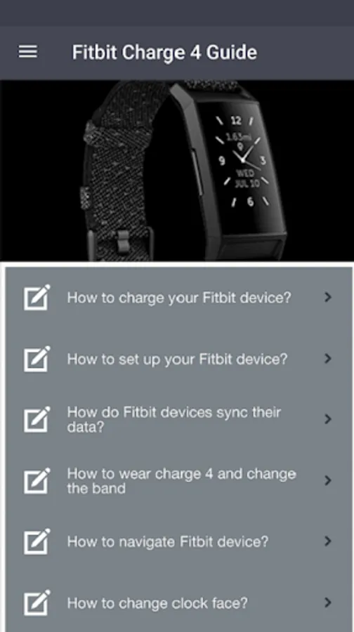 This mobile application is a guide that gives information about Fitbit charge 4. From this app, you can learn about device settings and usage, fitbit versa synchronization, band changing and wearing, fitbit charge 4 setup, how to charge the device, notification configuration, navigating, alarm setup and fitbit charge 4 watch face change.