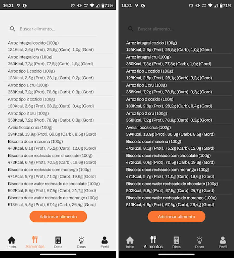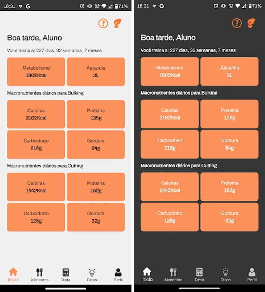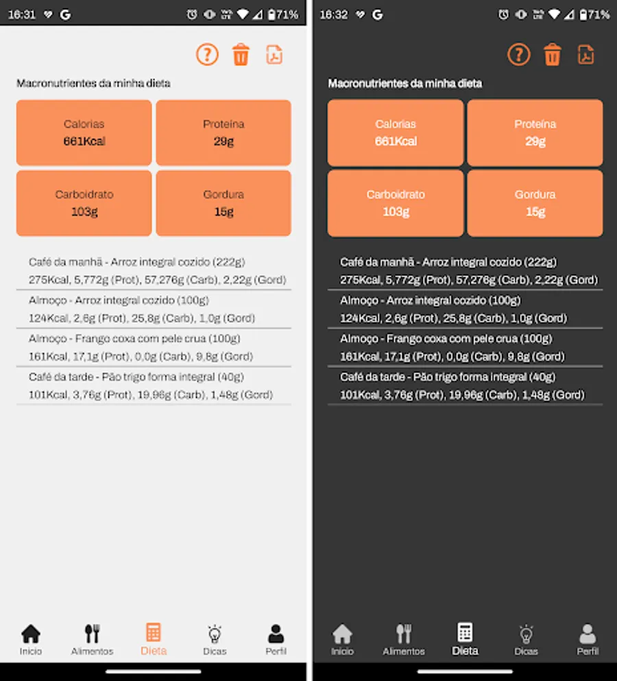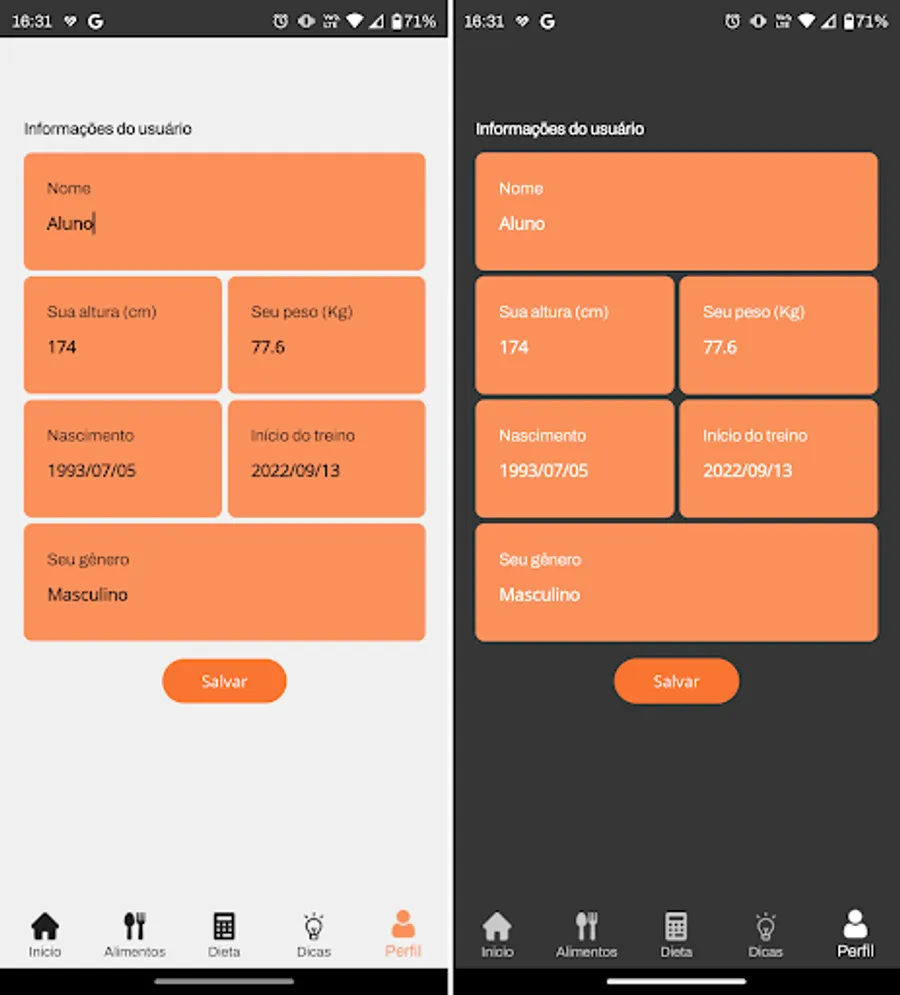 An initial registration is carried out and, from there, all the necessary macronutrients and their divisions are calculated, it is also possible to calculate your diet through the food tab and calculator, adding the specific portions in each meal.