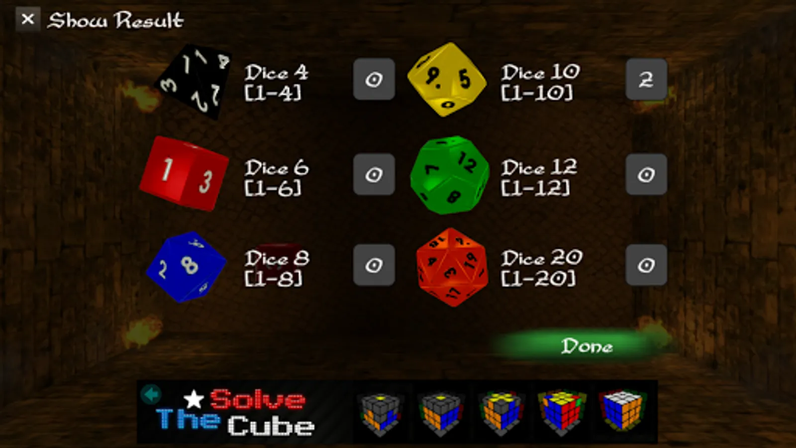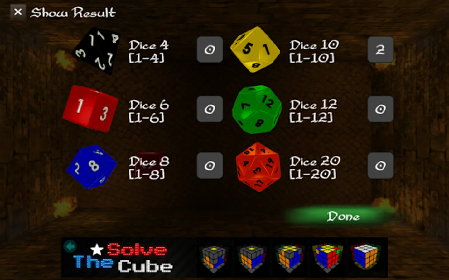 Now with d4, d6, d8, d10, d12 and d20 dice available.