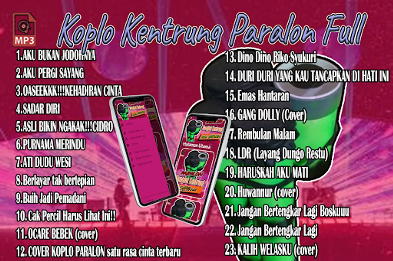 The Koplo Kentrung Paralon Full music application is an application that allows users to listen to MP3 music from dangdut singers Cover Koplo Kentrung Paralon and other special artists. The app is packed with features such as an easy-to-use music player, playlist and volume control.