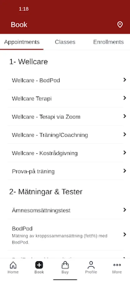Sök lediga tider för fysmätningar i kalendern (Bod Pod, VO2max, Ämnnesomsättning) och skicka bokningsförfrågan direkt via appen.