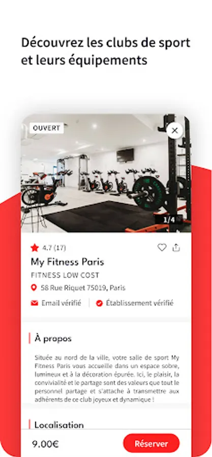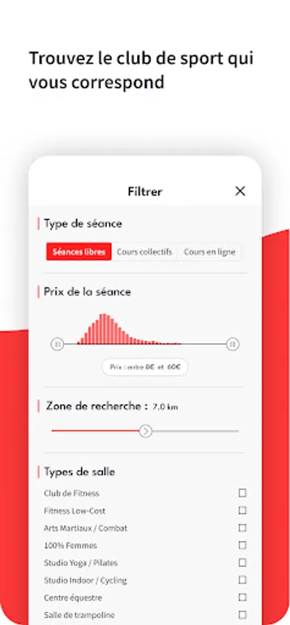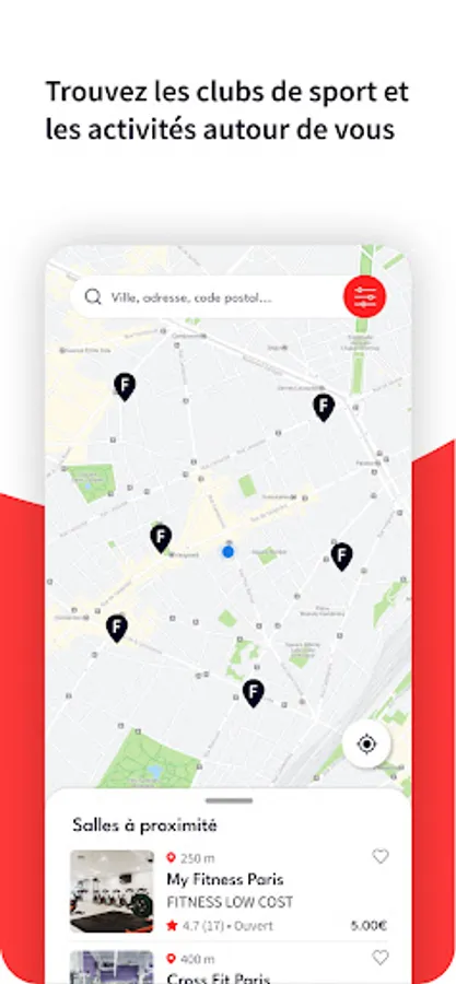 A geolocation system is available to locate the clubs around you within a radius of 50km. You can then book your workout in a few clicks and practice where you want and when you want.
