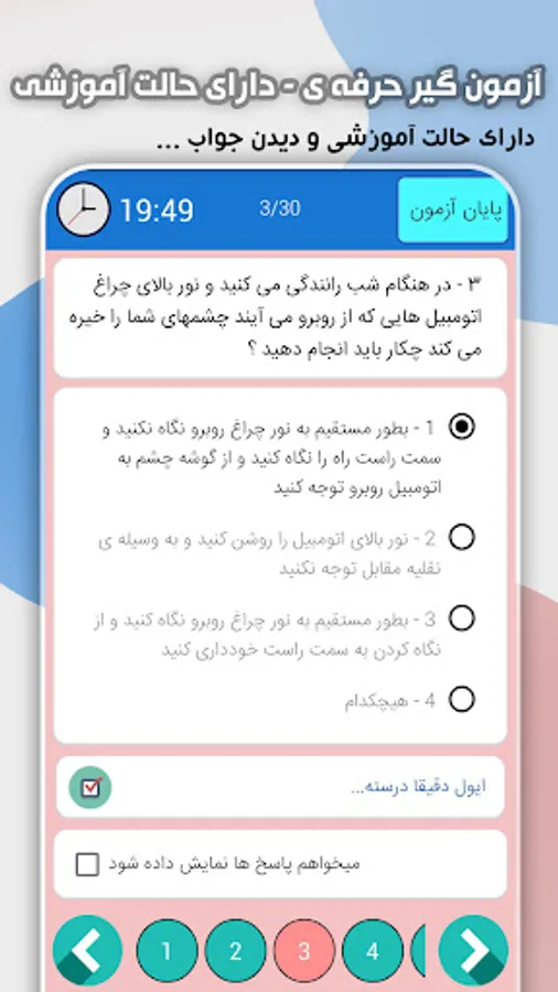 You can give as many as you want a test containing 30 random questions from the complete set of "traffic regulations" questions based on the standards of the regulations test and by repeating this test you will prepare yourself to participate in the traffic regulations test. .