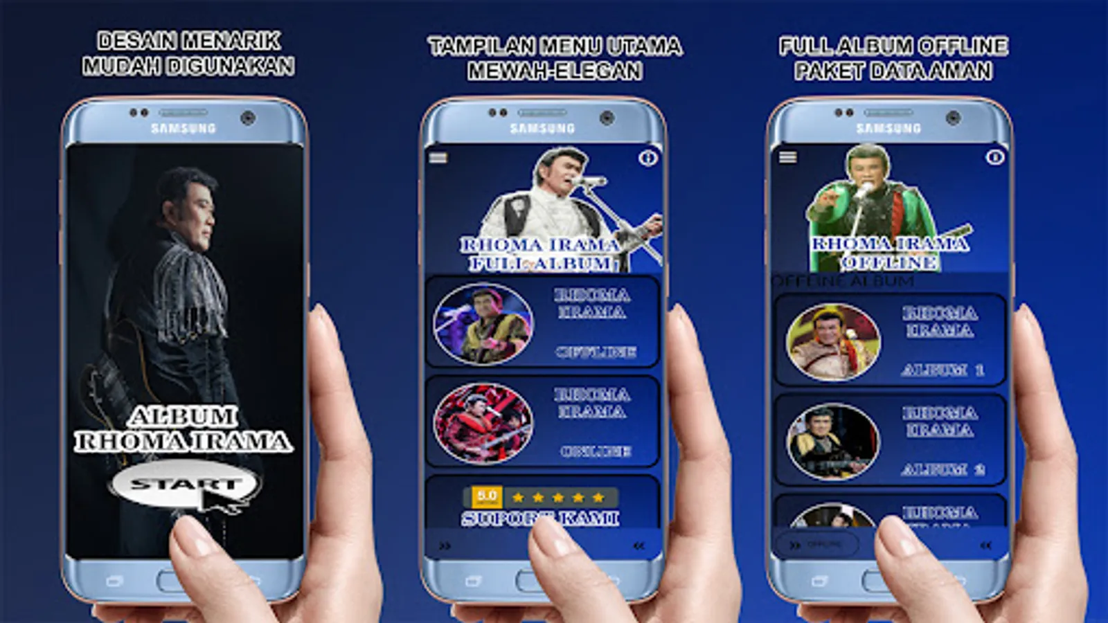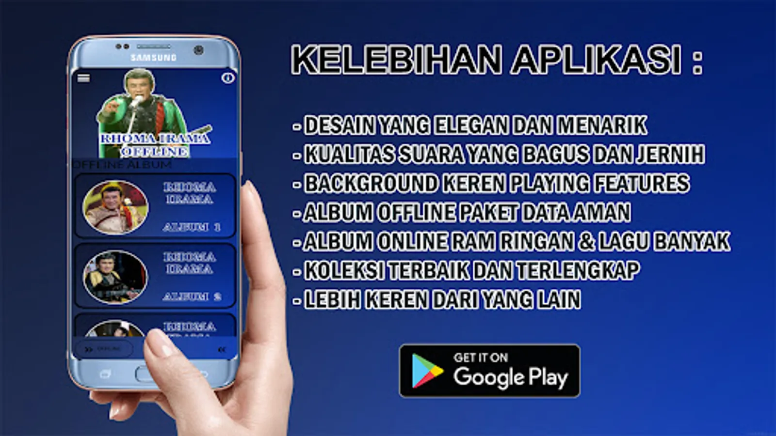 Complete Song Collection: This application provides a collection of Rhoma Irama songs in full albums. You can enjoy all the songs available without having to bother looking for them elsewhere. You will find a complete collection of Rhoma Irama songs from the 70s. Listen to popular songs like "Begadang," "Gitar Tua," "Darah Muda," and many more. Experience the magical touch of signature vocals and rocking musical arrangements.