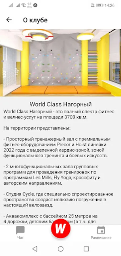 In the World Class app, you can view the schedule of group programs, sign up for workouts, view contract information, earn bonuses, share workouts with friends, chat with coaches and more.