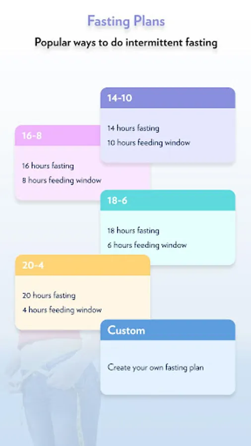 - Intermittent fasting timer with popular programs such as 16/8, 18/6 and 20/4