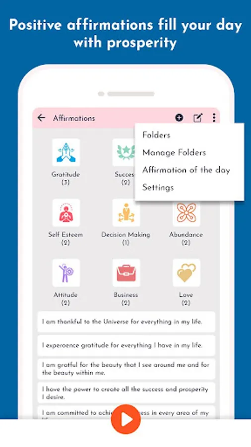 Positive affirmations includes: Gratitude, Success, Confidence, Self Esteem, Decision Making, Abundance, Attitude, Business, Love, Family, Relationship, Forgiveness, Law of attraction, Health, Exercise, Pregnancy, Beauty and women.