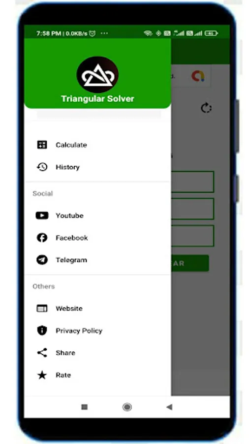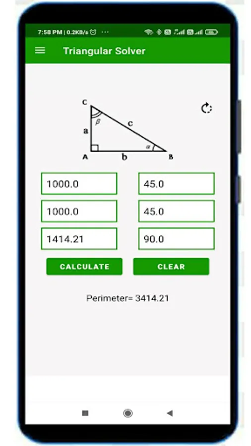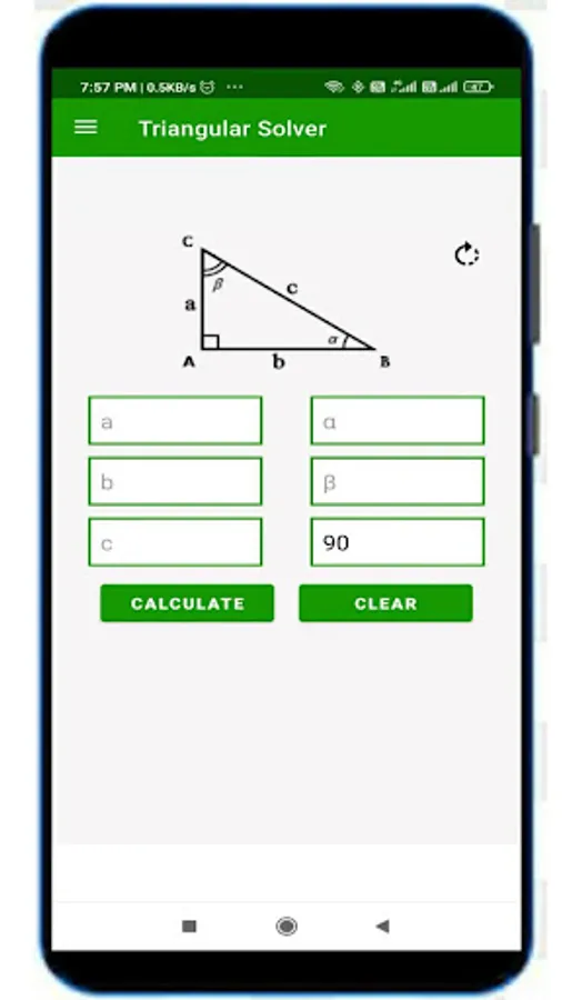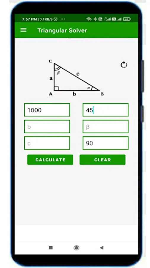 triangle solver app is used to calculate the sides and angles value by putting any one side value and one angle value.