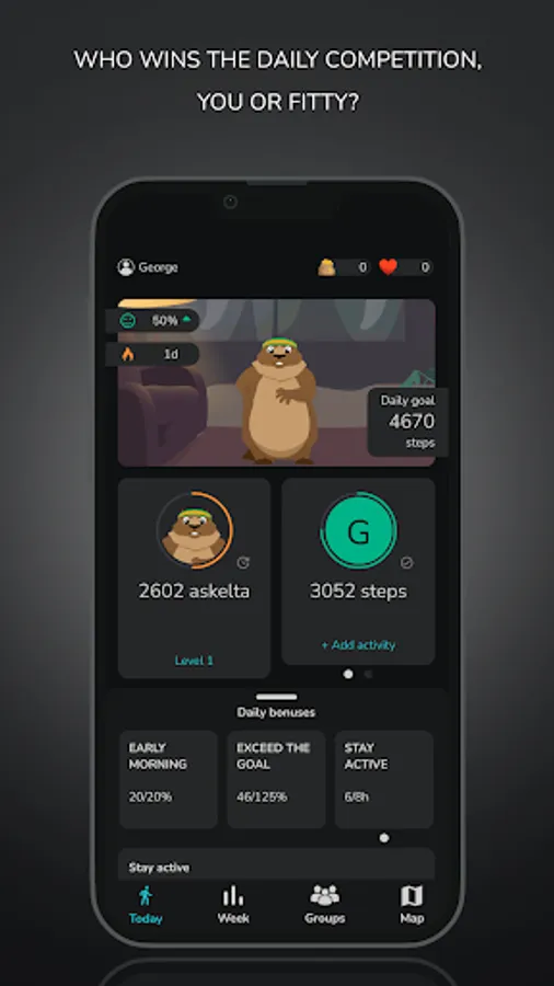 Don't have a friend to move with? Try working out with Fitty Murmel! Fitty Murmel will keep up with you and motivate you to be the better version of yourself. The level of the challenges will be close to your comfort, so it doesn't matter if you're a professional athlete or a sunday jogger!