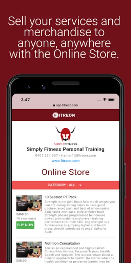 * Sell single or blocks of sessions (and anything else you wish) to your clients via your device.
