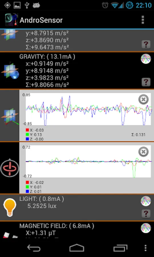 * For more information, please visit AndroSensor's website. Also, please be encouraged to email me at fivasim@gmail.com to report a bug, suggest an improvement or just ask a question about the app.