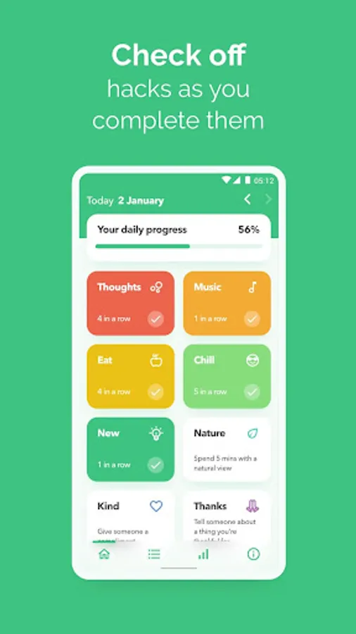 There are so many facets to the Psychology of wellbeing that it can be daunting trying to get to grips with all the advice. WellSenz takes this research and simplifies it into easy-to-use hacks. Once you get used to them, you’ll begin to see how and why they work. At that point you’ll be able to branch out from the hacks on the app and use your own ideas, but you can still use the app to track your progress.