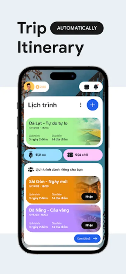 Smart planner: Trips will be generated automatically base on your experience while using the application. You can easily control your trip, adding more places or removing the unfavorite out of your plan. We provide a map view that could help you easy to control the timing & distances in a day plan.