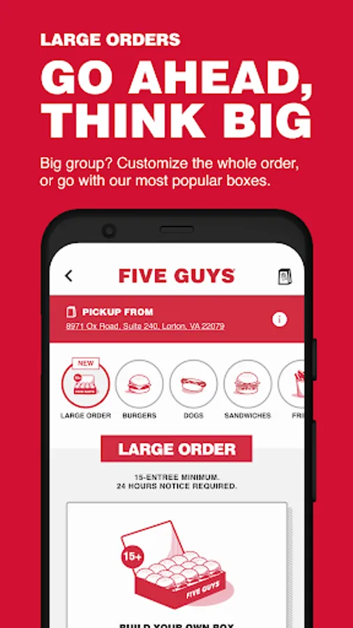 EASY REORDERING - Get all of your Five Guys faves faster with saved meals and recent orders.