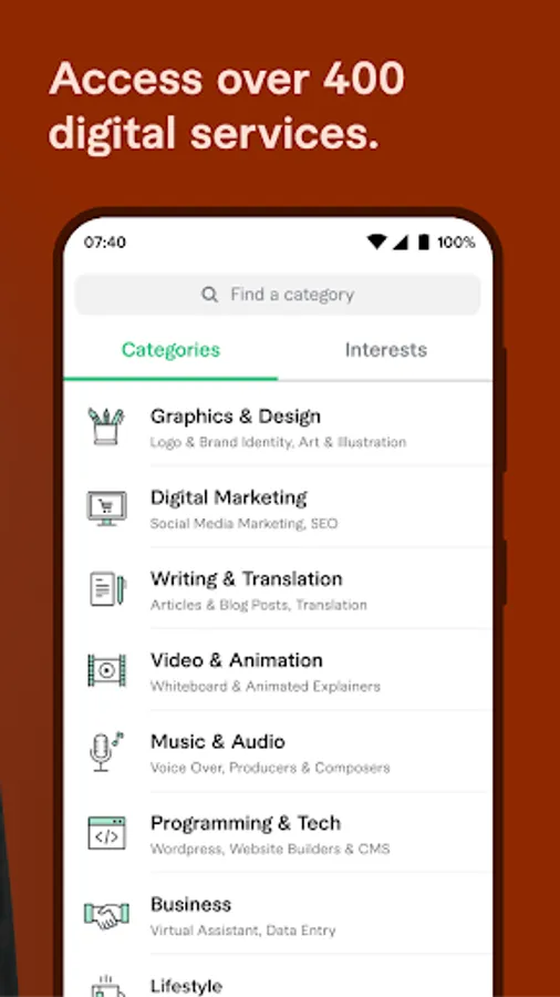 Search, filter, and choose from thousands of freelancers across 400+ different service categories: