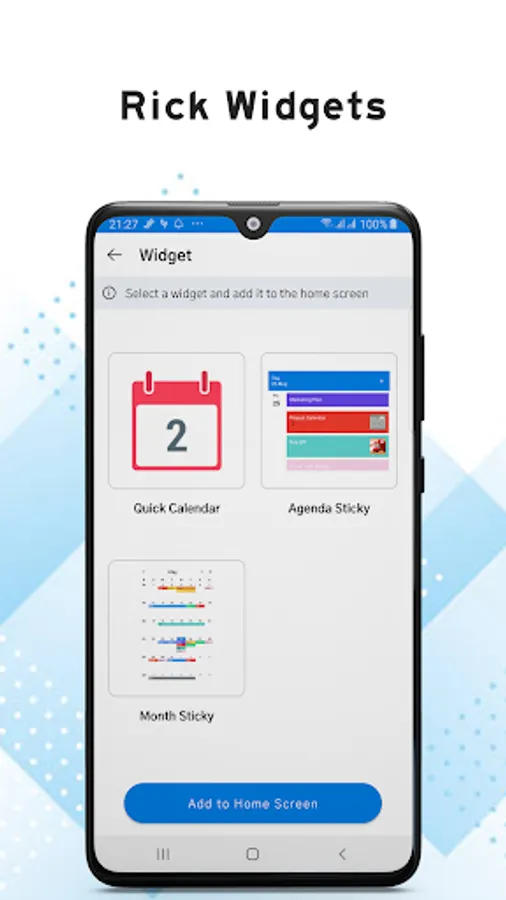 Calendario have 3 types of widgets: Quick Calendar, Agenda Sticky, Month Sticky. You can easily create events, view to-do lists right at the home screen.