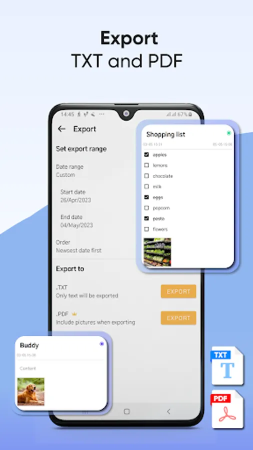 ✔️ Supports exporting notes and checklists as TXT or PDF