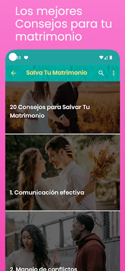 ✅ Advice and Tips to Strengthen the Relationship: The "Save your Marriage" app offers a wide variety of practical and effective tips to improve communication, manage conflicts, maintain intimacy and build a healthy and happy relationship. From expert advice on couples therapy to inspiring testimonials, the app covers key topics to help couples overcome challenges and grow together.
