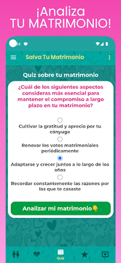 ✅ Relationship Assessment Quiz: A highlight of the application is the "Quiz about your Marriage or Couple" section. Users can take interactive quizzes designed to assess the health of their marriage and spot areas for improvement. These quizzes allow for a self-assessment that offers an objective perspective of the relationship and suggests areas that users can focus on to improve their emotional bond.
