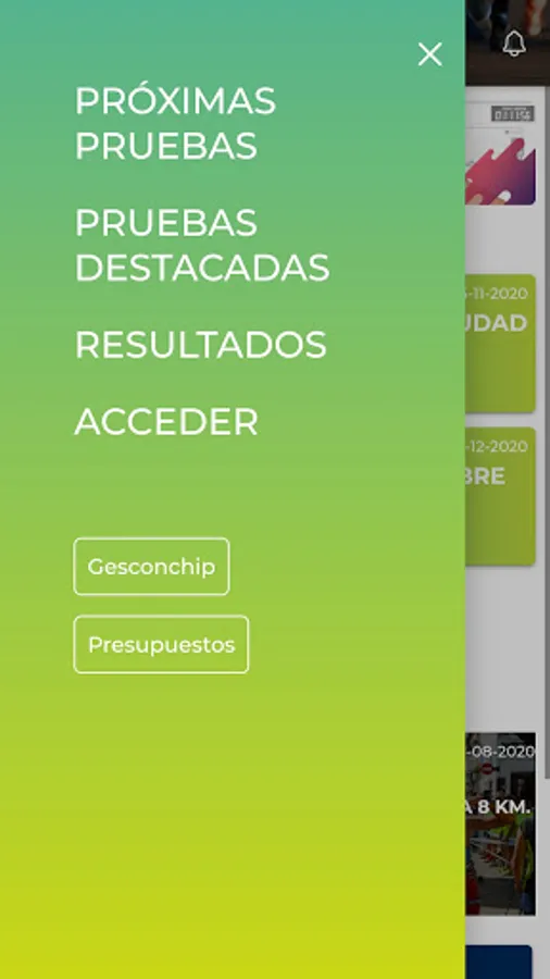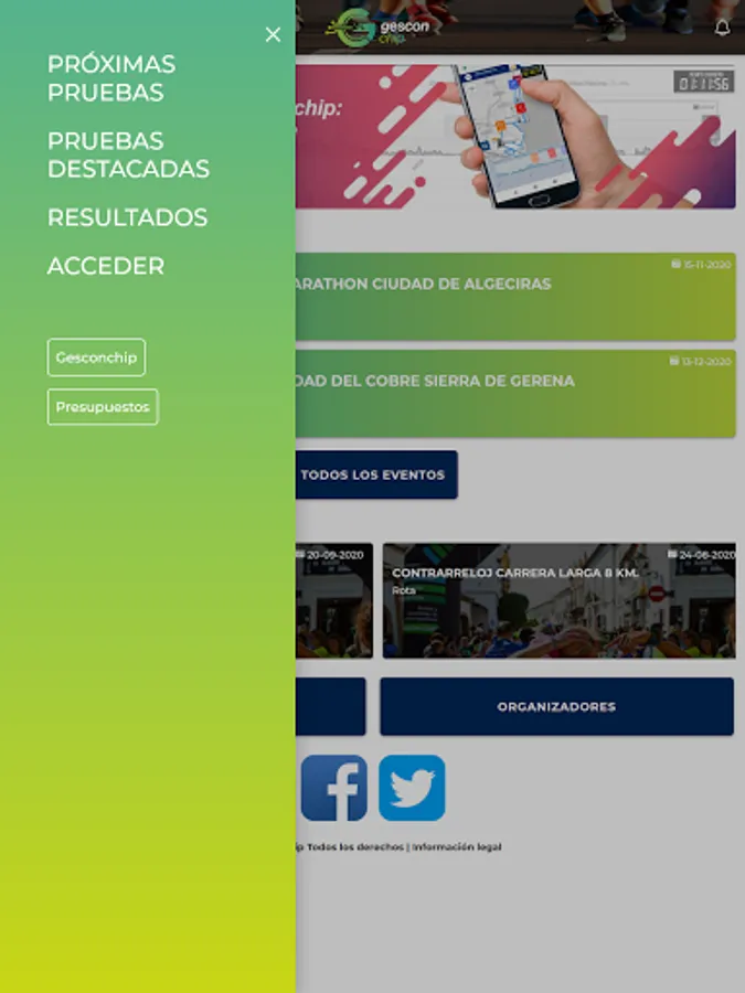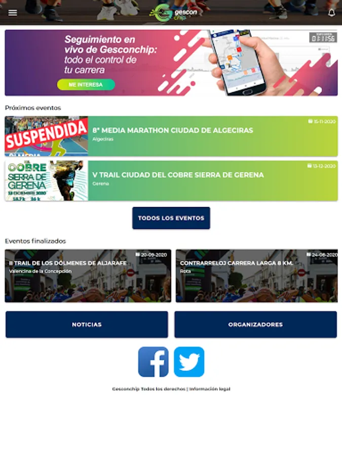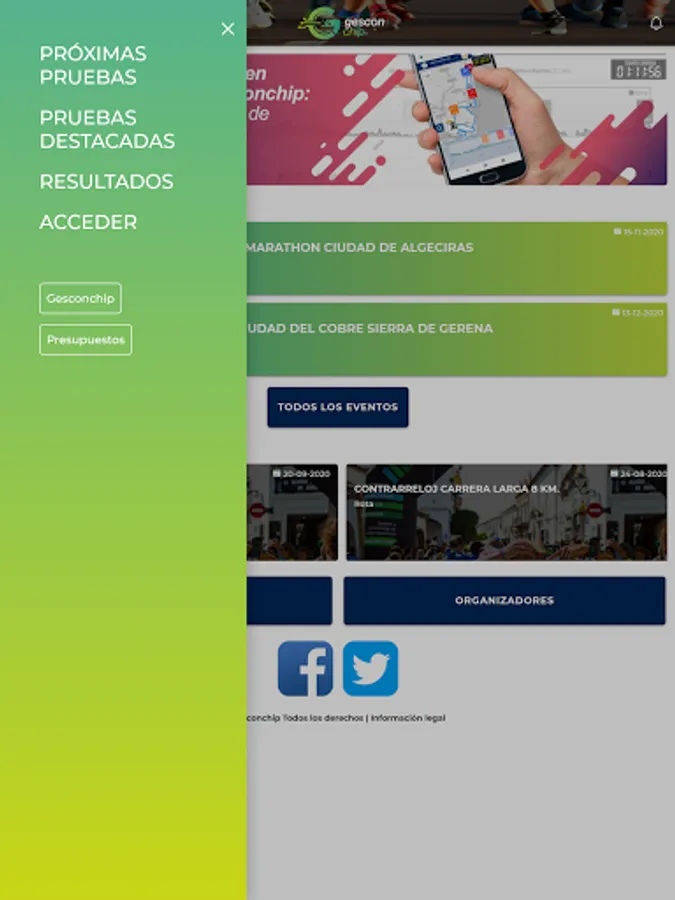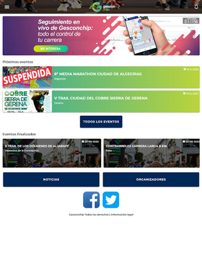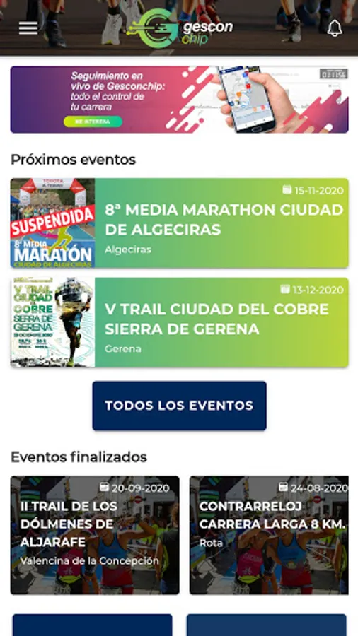 Sign up for sports events and check your results through the Gesconchip APP, a leading company in sports timing in Andalusia. Download this application and you will be able to check the sporting events calendar from your mobile phone, make your registrations, track the races online and check the classifications and your times and results. We do it fast and easy, with all the technology at the service of the athlete.