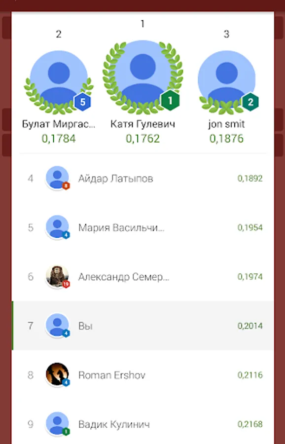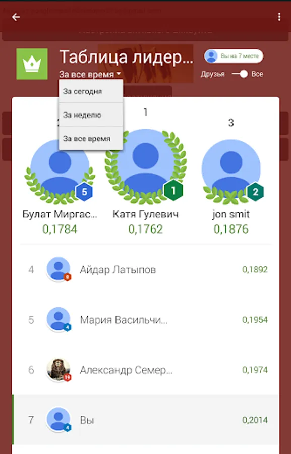 Online leaderboard - the best response, better attempts, etc. (Total / for a certain period / among friends / results of all over the world).