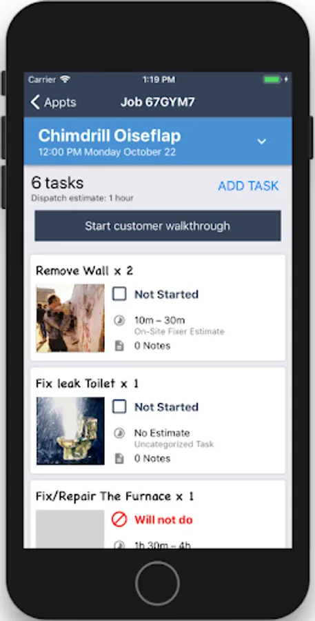 Helper app for fixers to get jobs, enter data, take photos, track time, generate bills, and keep tabs on reviews and tips.