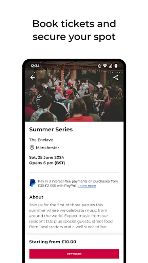 Seamless ticket booking: Booking tickets has never been easier. Secure your spot at your favourite events in just a few taps. Save your card details for fast checkout, pay in instalments to split the cost, and check out seamlessly from your phone.
