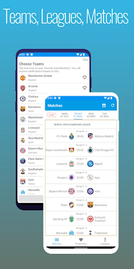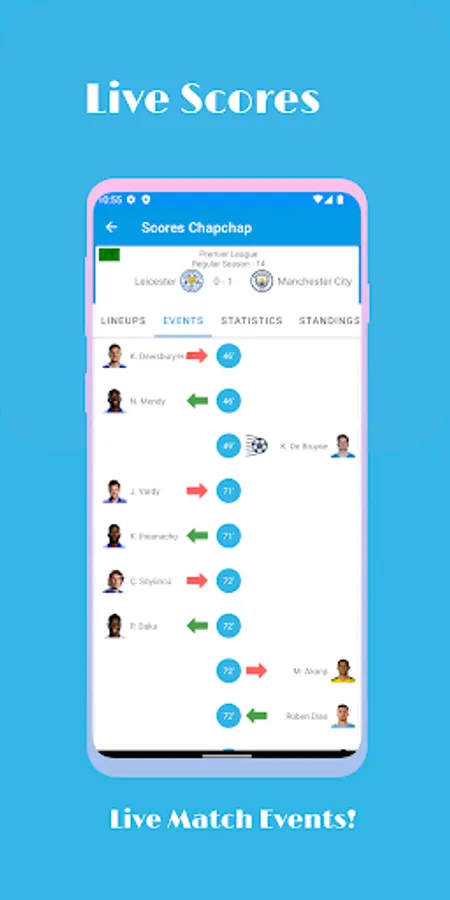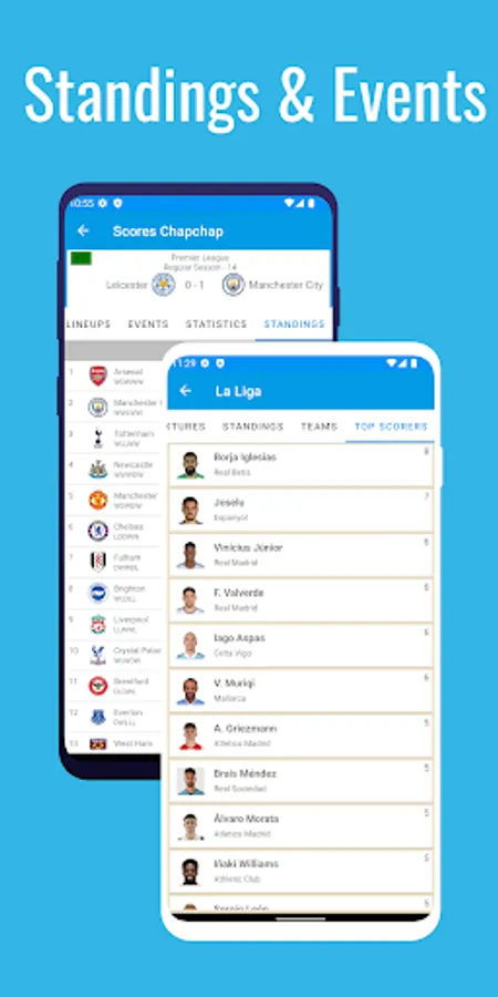 The app provides live scores, match schedules, and standings for leagues around the world, including the Premier League, La Liga, Serie A, Ligue 1, and more.