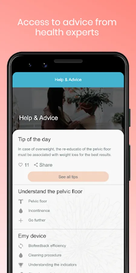 The scientific and educational content in the app helps you to better understand the pelvic floor and urinary incontinence. Furthermore, you can access many tips written by health professionals specialized in pelvic floor therapy for more effective training. Get ready and regain control of your body!
