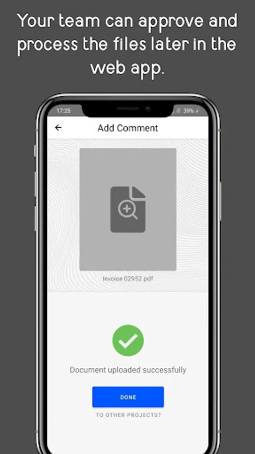 Use the mobile app to upload all project-related files such as receipts, invoices, and contracts to Planyard for further approval and processing. Either take a picture of the documents or choose from existing files in your phone.