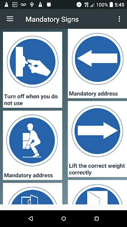 This app shows the main mandatory signs used in mining, oil, electrical and other industries.