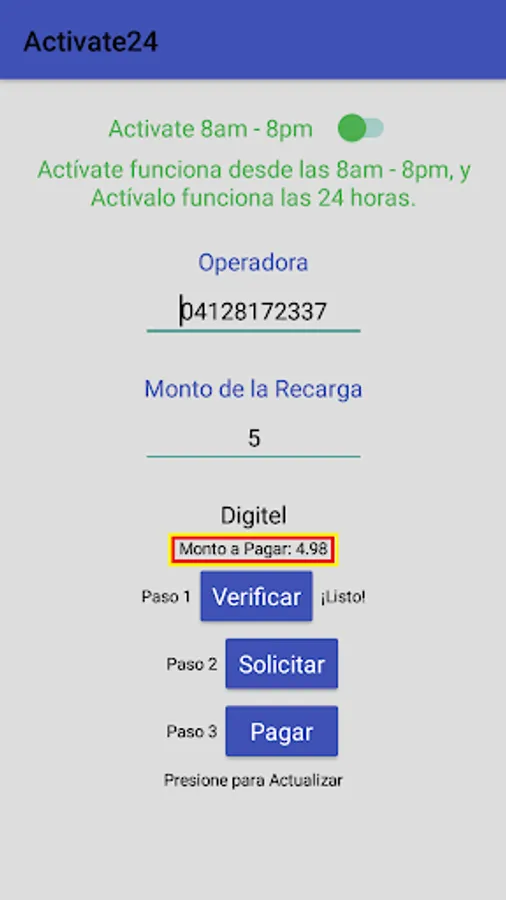 With Actívate24, you can also recharge Digitel, Movistar and Movilnet services 24 hours a day, you only have to make an advance payment equivalent to $ 10 in bolivars.