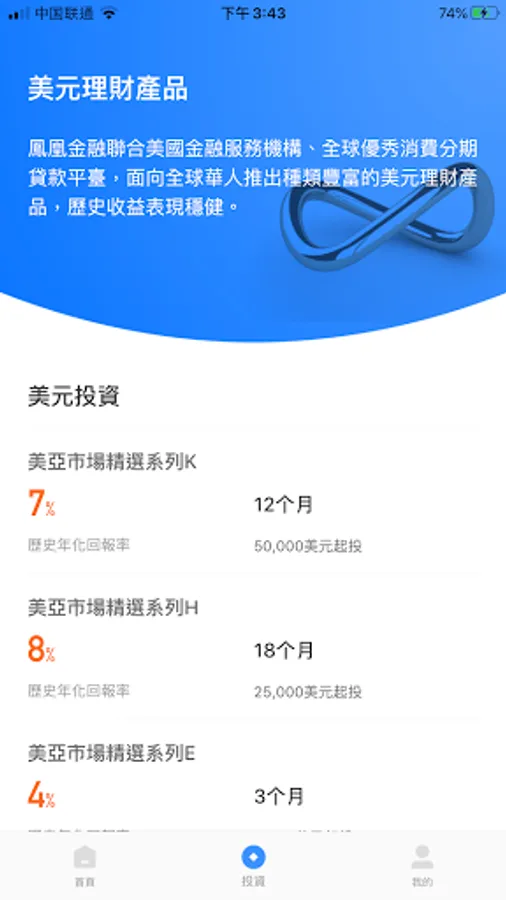 Product flexibility and richness: 1-12 months period, 4%-8% annualized income, diverse products, flexible investment, minimum purchase of US$5,000