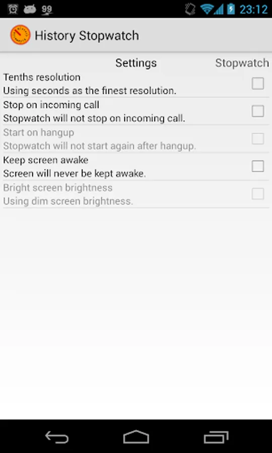 * Option to stop stopwatch on incoming call and to start it again at hangup.