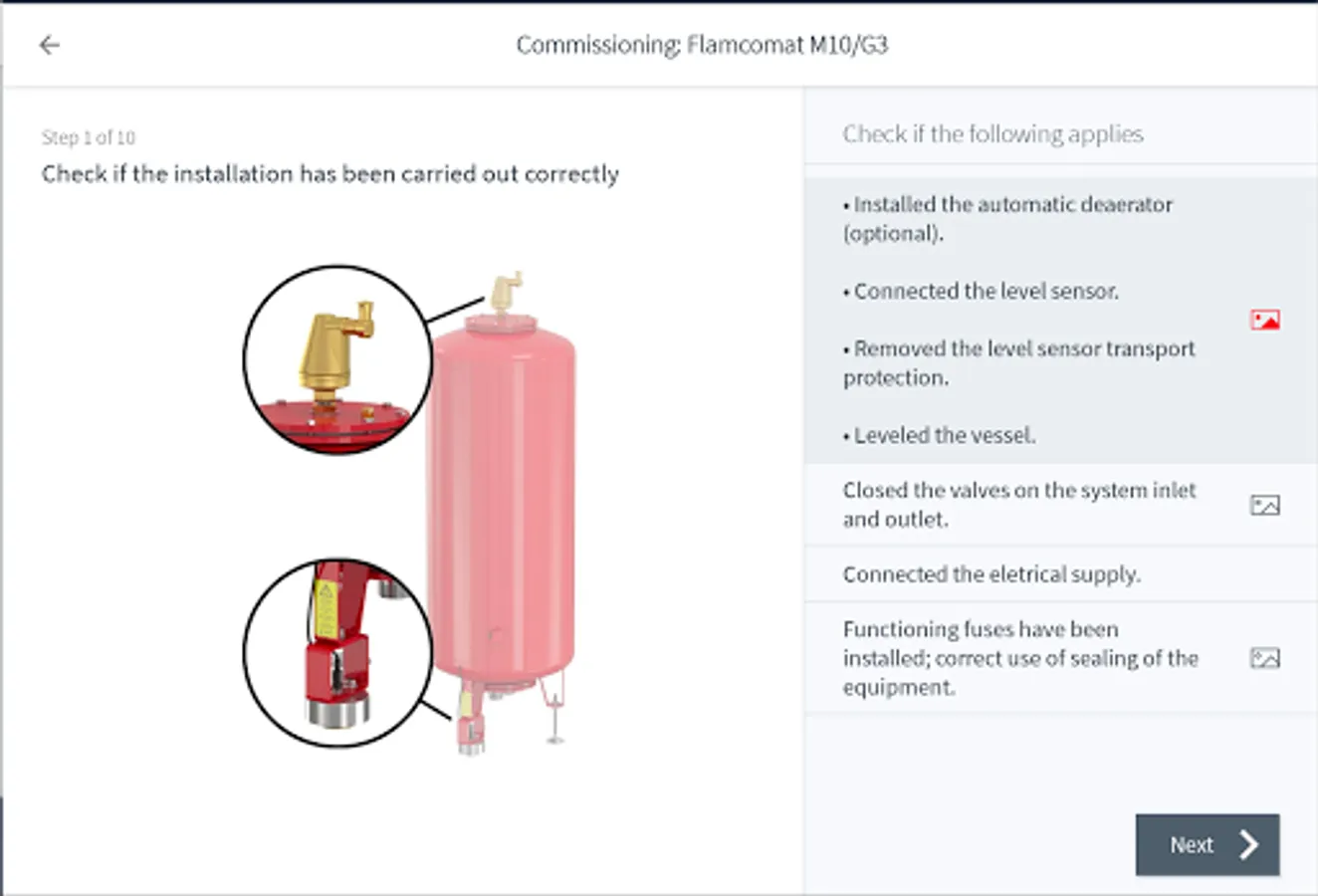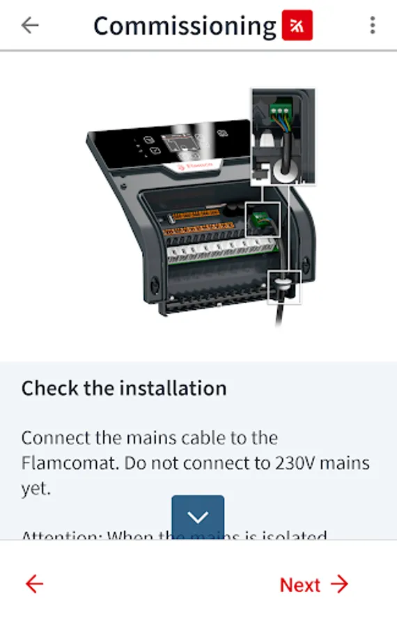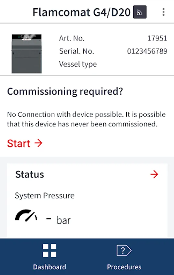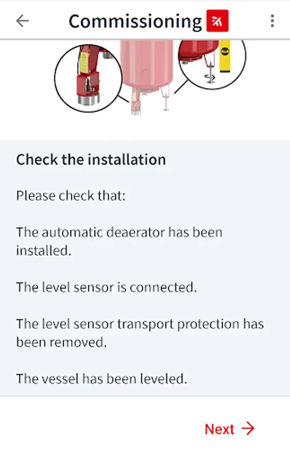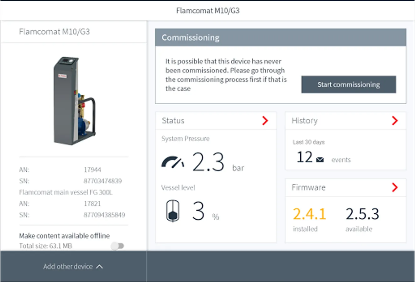 Just scan the product QR code and the app will connect to your Flamco device. Now you are ready to install the product with helpfull guidelines displayed in the app step by step. A wizard will guide you through the commissioning steps.