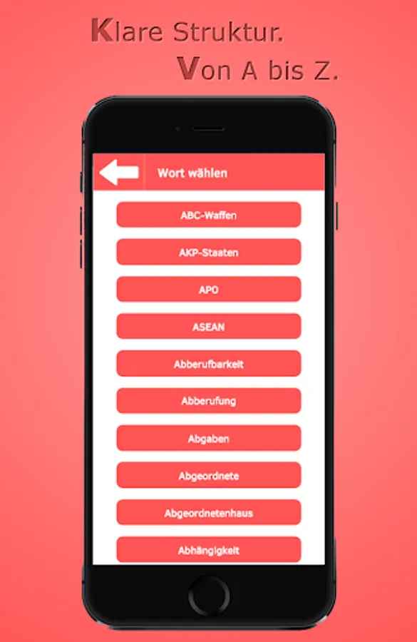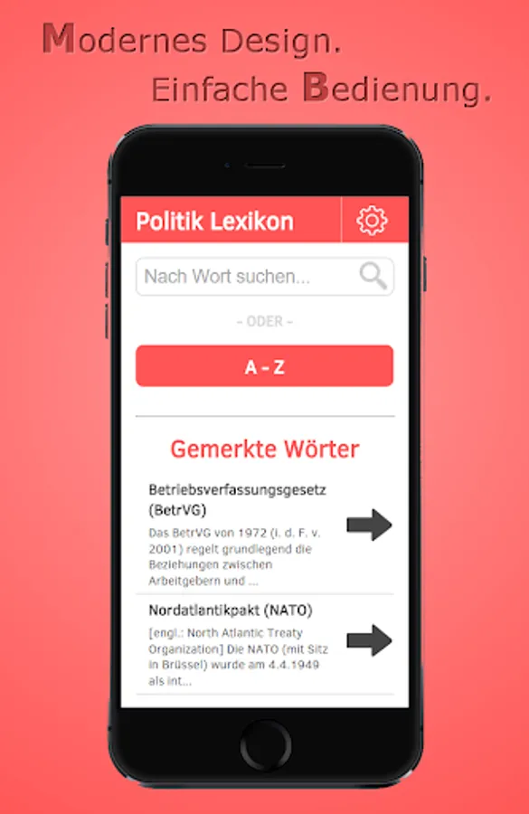 In this app you can find all the important words of German politics again. Using the simple designs you can in seconds