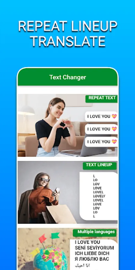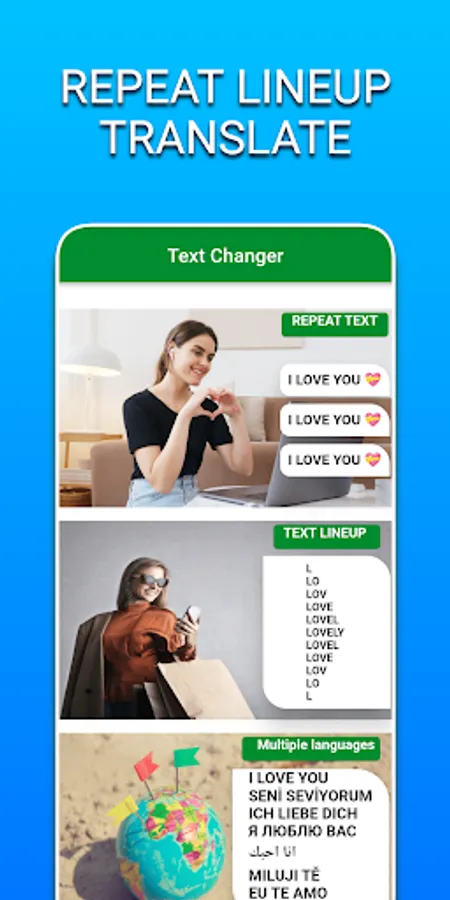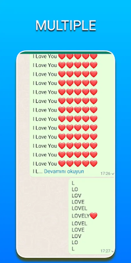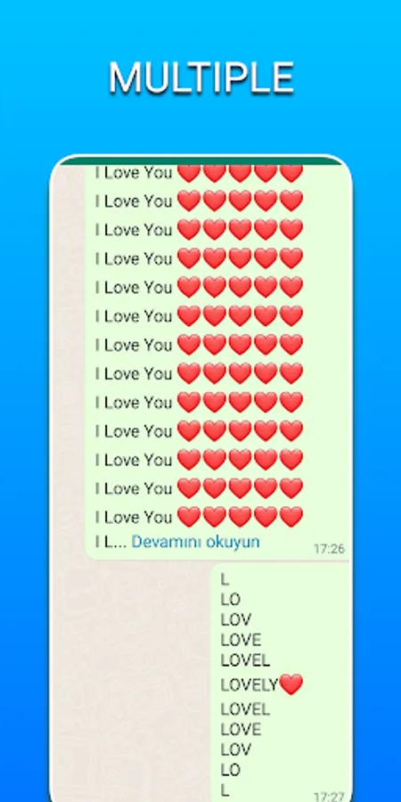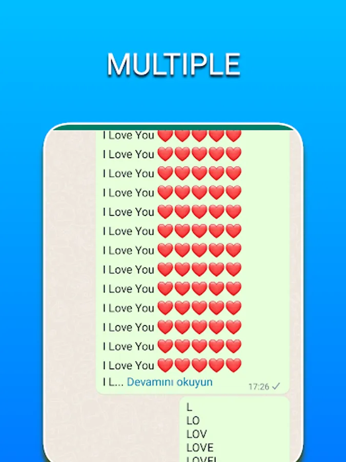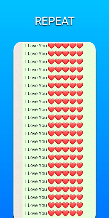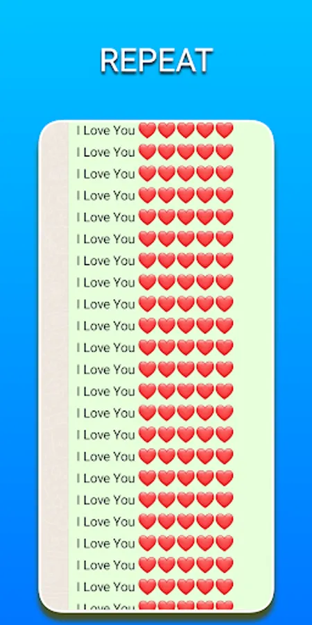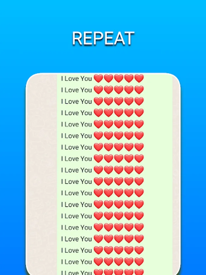You can send the same message multiple times - edit your messages - make your messages fun in all languages. It is a kind of message repeater to send messages over and over and you can also set your repeat limit with newline text repetition. Using this app you can also create repeating letters using alphabet and emoji characters. Also provide random emoji characters. It's very easy to use and requires a few clicks for your reposts. The repetition process works asynchronously for longer repetition limits.