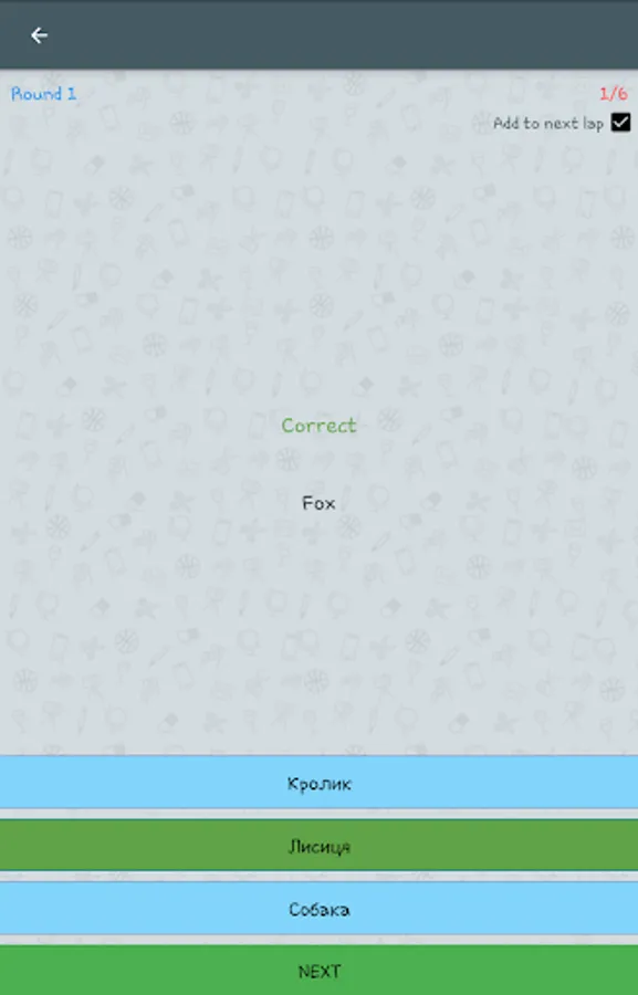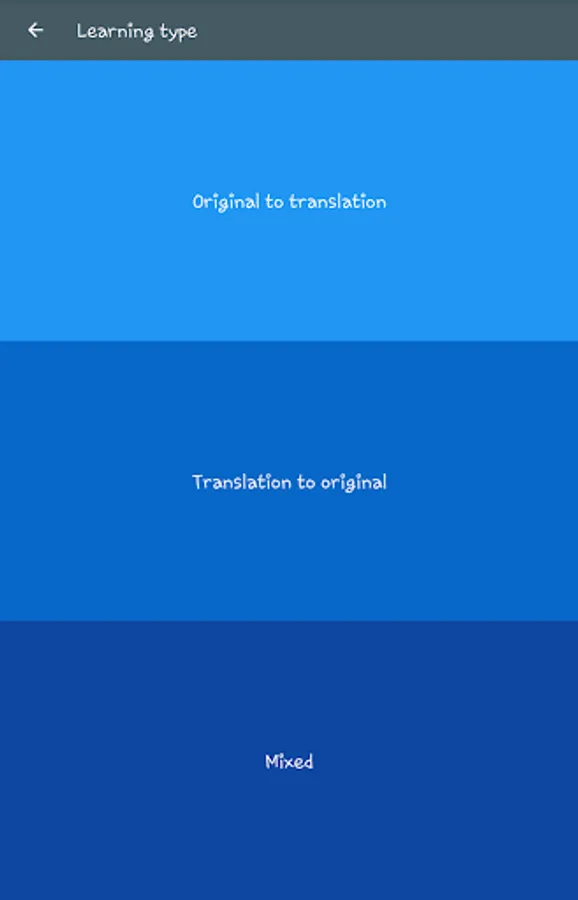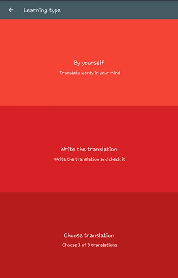 The program has 3 types of study: direct translation, reciprocal translation and mixed and 3 modes of study: on your own, write words or choose 1 of 3 correct translations