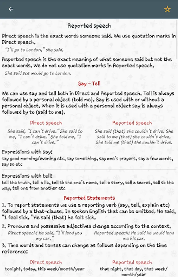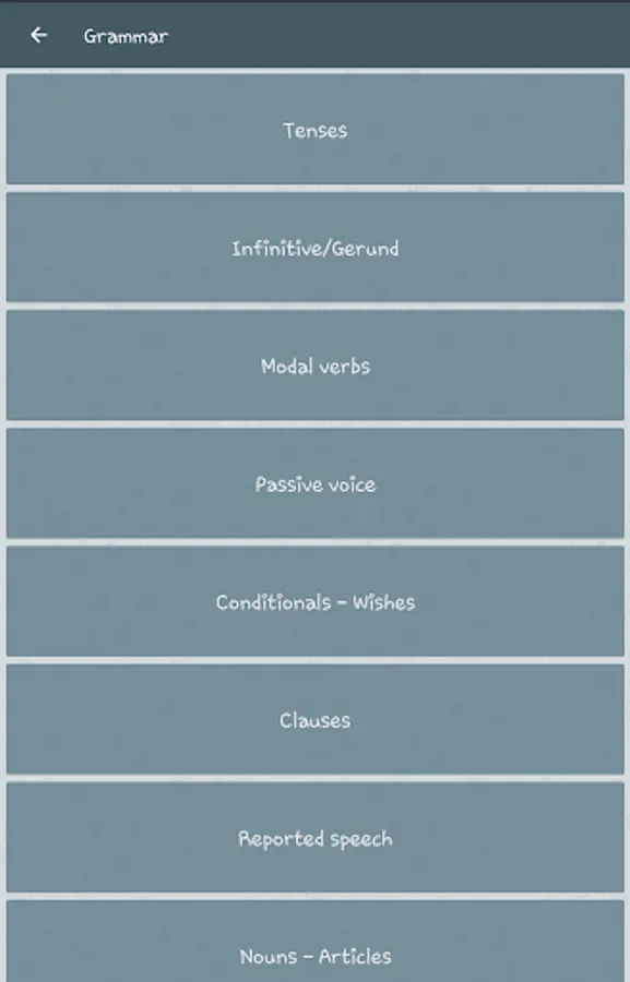 Grammar is sorted by topics and you can easily access it. There are a lot of topics, for example tenses, conditionals, modal verbs, etc.
