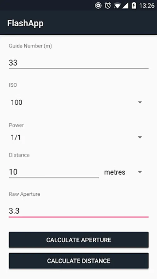 A lightweight and easy to use app for guide number calculations! Simply enter your flash guide number, ISO and power level to calculate your camera aperture settings or required distance for optimum exposure.