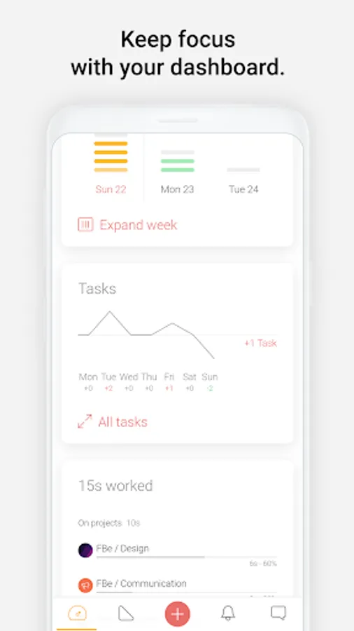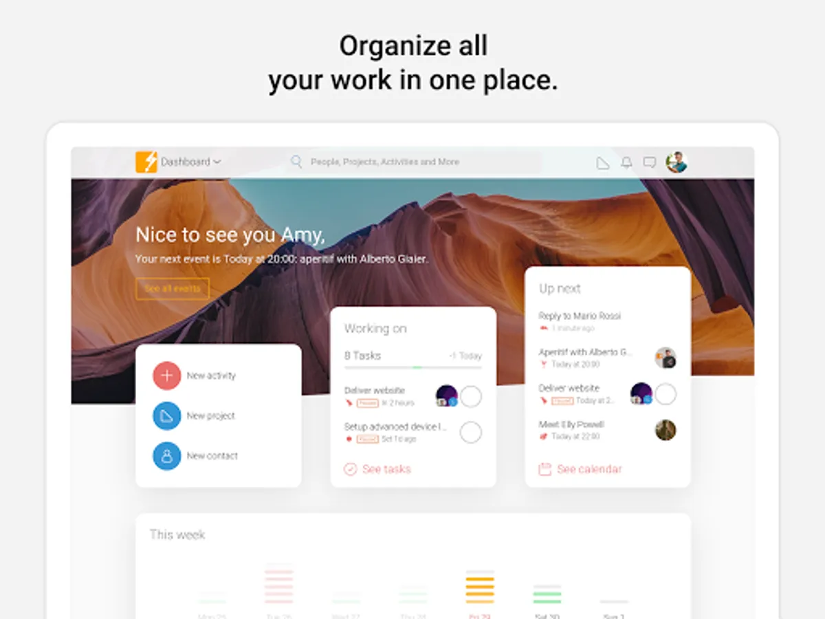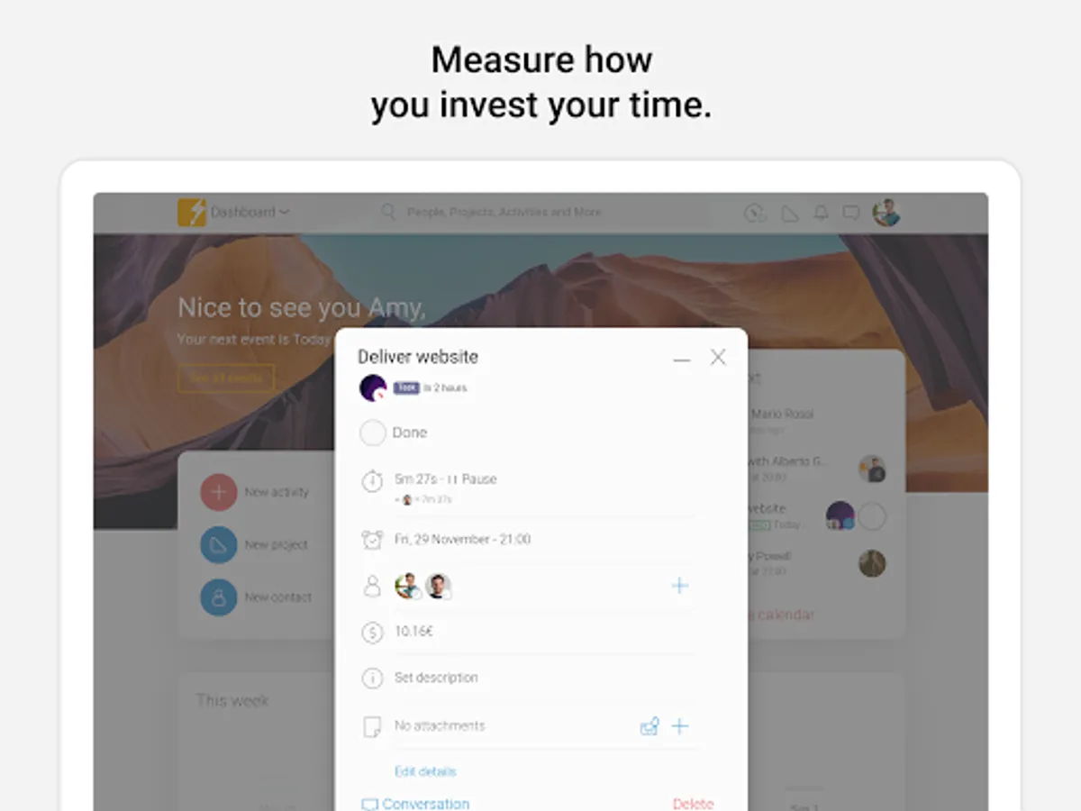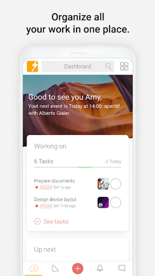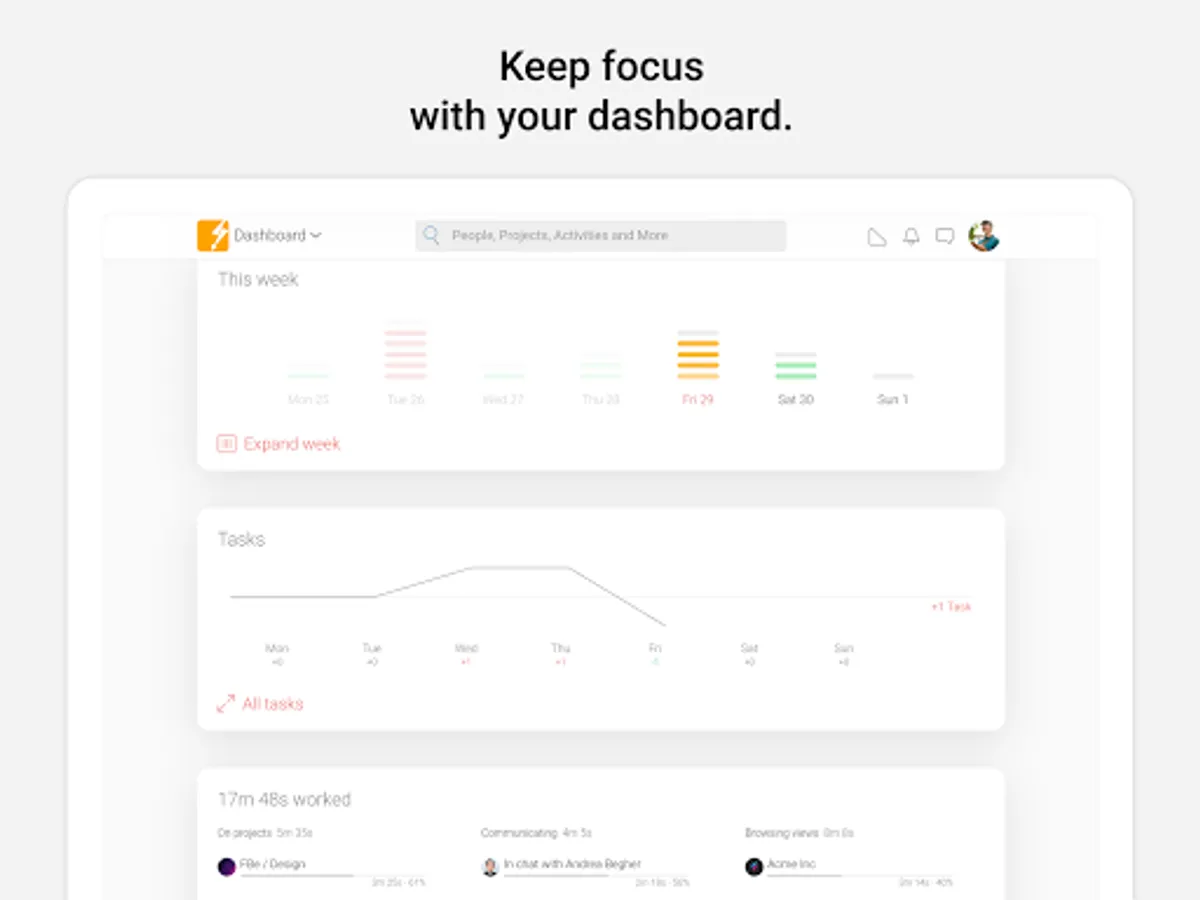 Everything you do and have to do is summarised in your dashboard. It's the place where you start to work everyday: your tasks, appointments and work-time analytics are all in one place, helping your mind to focus just on what’s next.