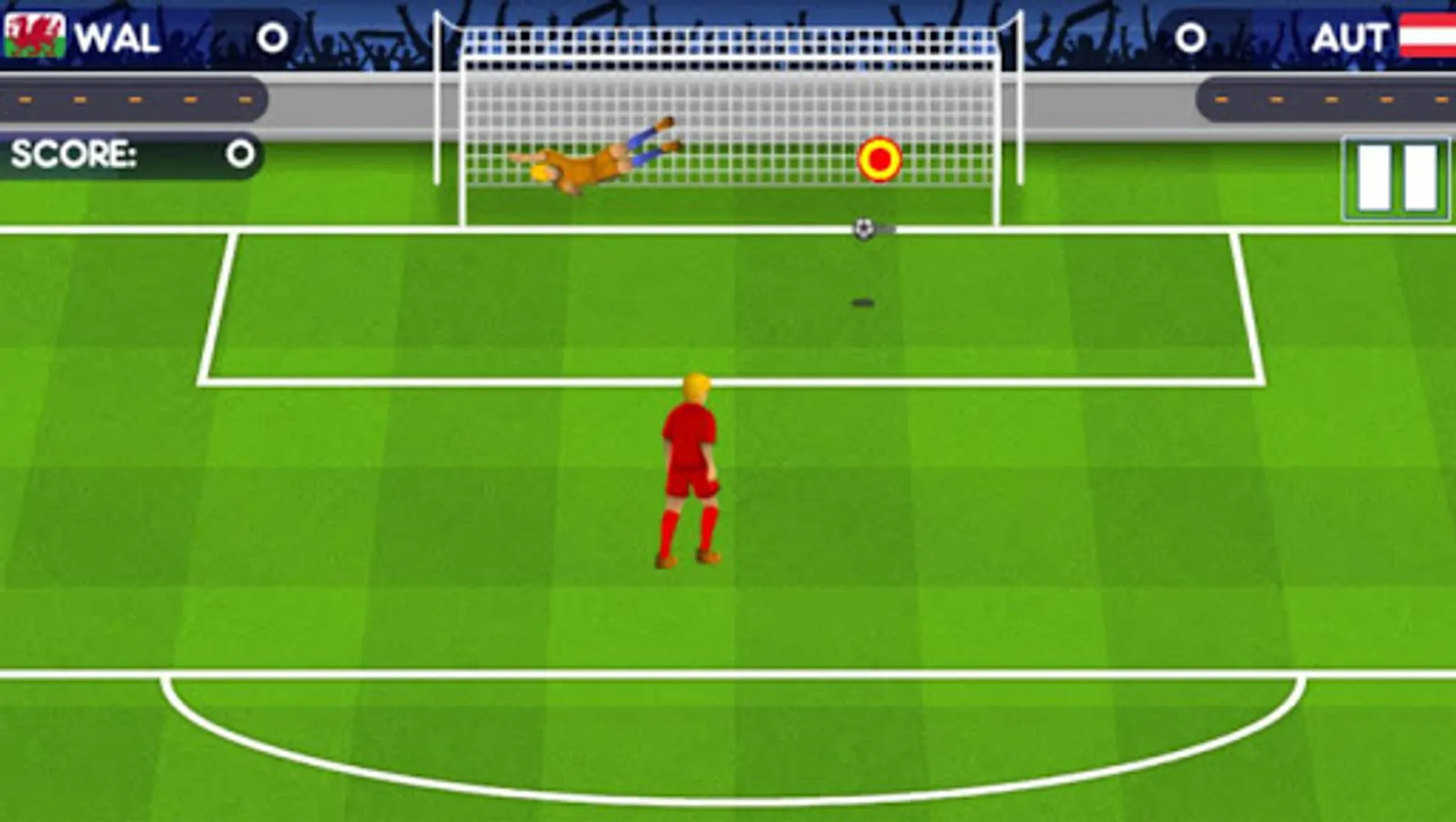 In order to shoot, click anywhere to determine direction, height and strength of the shot. With combination of these, you can perform powerful kicks, but also gentle lob shots. In the role of goalkeeper, watch out for the target which will appear on your goal just before the opponent's kick, and tap on it.